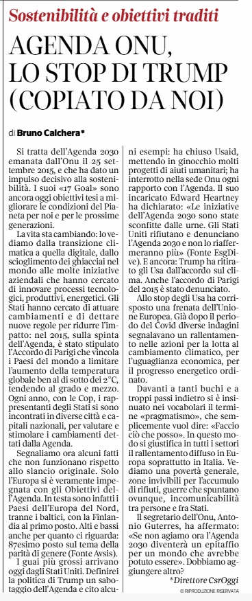 I guai più grossi arrivano oggi dagli Stati Uniti. Definirei la politica di Trump un sabotaggio dell’Agenda e cito alcuni esempi: ha chiuso Usaid, mettendo in ginocchio molti progetti di aiuti umanitari; ha interrotto nella sede Onu ogni rapporto con l’Agenda. Il suo incaricato Edward Heartney ha dichiarato: «Le iniziative dell’Agenda 2030 sono state sconfitte dalle urne. Gli Stati Uniti rifiutano e denunciano l’Agenda 2030 e non lo riaffermeranno più» (Fonte EsgDive). E ancora: Trump ha ritirato gli Usa dall’accordo sul clima. Anche l’accordo di Parigi del 2015 è stato denunciato.