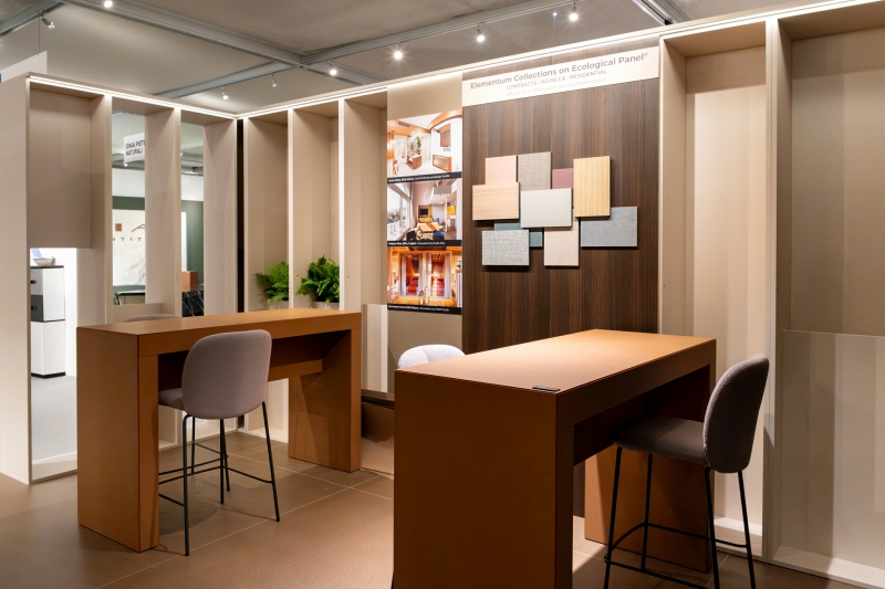 Lo stand, realizzato interamente in Pannello Ecologico®, si distingue per la sua architettura essenziale e permeabile: un ambiente aperto e fluido, pensato per accogliere il visitatore in un percorso esperienziale che valorizza la ricchezza e la varietà della proposta decorativa dell’azienda. Un gesto concreto di sostenibilità: grazie all’utilizzo del Pannello Ecologico®, sono stati salvati 157 alberi.
