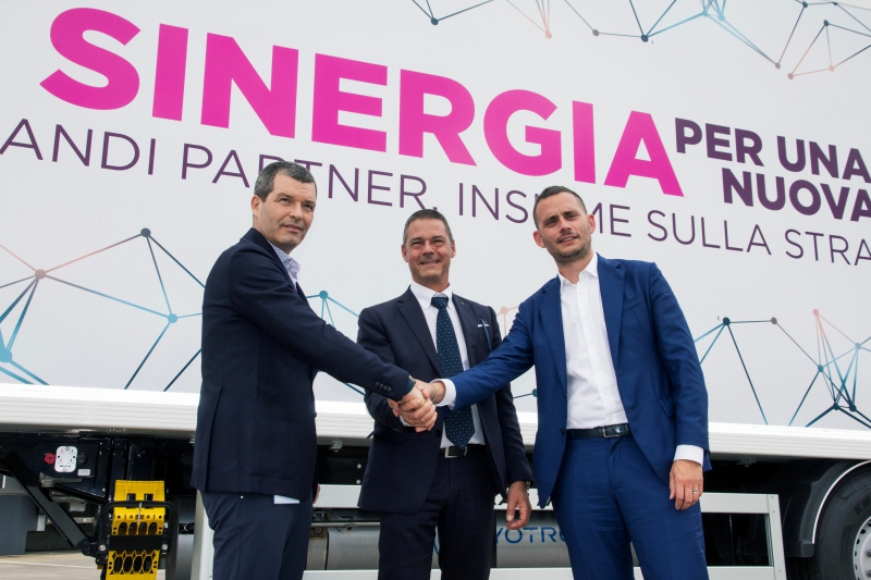 Da sinistra: Luca Ros, Direttore Logistica Lidl Italia; Massimiliano Pompei, CEO di Daimler Truck Italia; Michele Ambrogi, Direttore Operativo di LC3 Trasporti