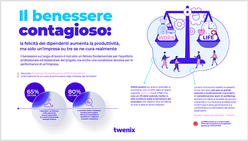 «Il wellbeing è sempre stato al centro dell’attenzione dei team di HR: in base alle proprie dimensioni, alla propria disponibilità economica, alle necessità e agli obiettivi da raggiungere, ogni azienda ha offerto cataloghi di partnership, sconti, voucher e opzioni diverse ai propri dipendenti», afferma in proposito Beatriz López Arredondo, Head of People di Twenix, società impegnata nel settore EdTech che offre percorsi formativi in inglese a imprese e professionisti. «La vera rivoluzione rispetto al passato è che non sono più soltanto le grandi aziende, o multinazionali a prendere in considerazione piani di wellbeing, ma sempre più startup fondate da giovani e aziende in cui lavorano professionisti millennials e della generazione Z».